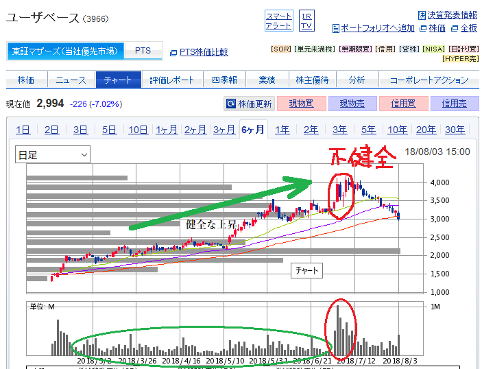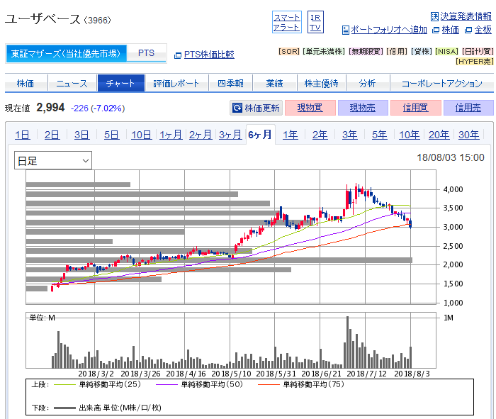 ユーザベースは立て続けに良いタイミングでニュースが出ていました。最後の締めはQuartz MEDIA LLC.買収でした。その後7月9日くらいまでは、そのまま5000円まで行くという雰囲気だったと思いますが、さすがに出来高を伴って急上昇した株は必ず一旦下がります。