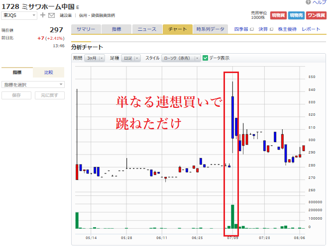 この中で既に1728 ミサワホーム中国は、株価に反応がはっきりと出ていましたが、結局は連想買いレベルなので、いまはまた下がって落ち着いています。