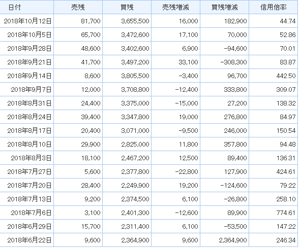 直近では、株価下落に伴っての信用買い残の増加状態なので、需給はいまいち。