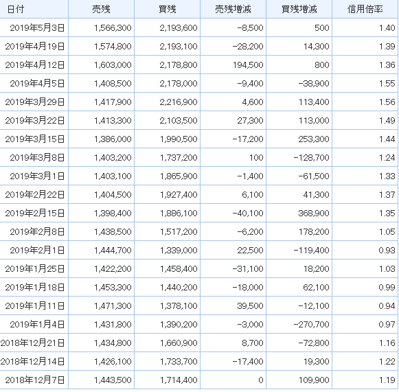 2019年2月8日週から信用買い残が増えていますが株価は下落トレンドですので、需給は悪いですね。