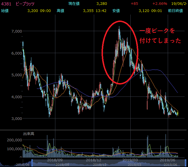逆に言うと、一度動いて高値を付けてしまっている銘柄、例えばビープラッツのような銘柄はしばらく上昇が期待できないようにも感じがします。
