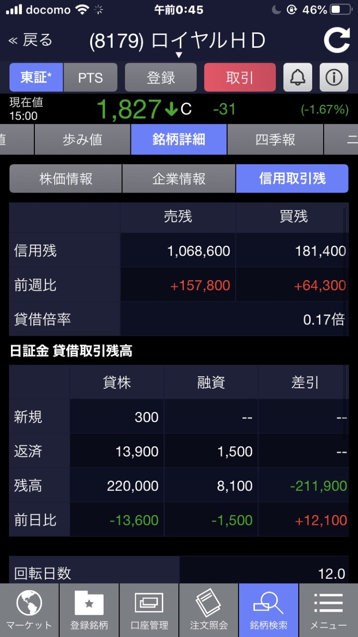ロイヤルホールディングスは、圧倒的な信用売り残の多い需給状態です。