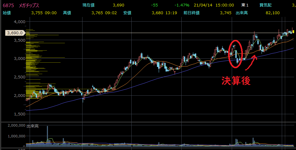 あと決算発表は出尽くしとの闘いがあり、最近ですと決算が良かったのに売られたメガチップスが記憶に新しいですね。良かったら、この記事をお読みください。