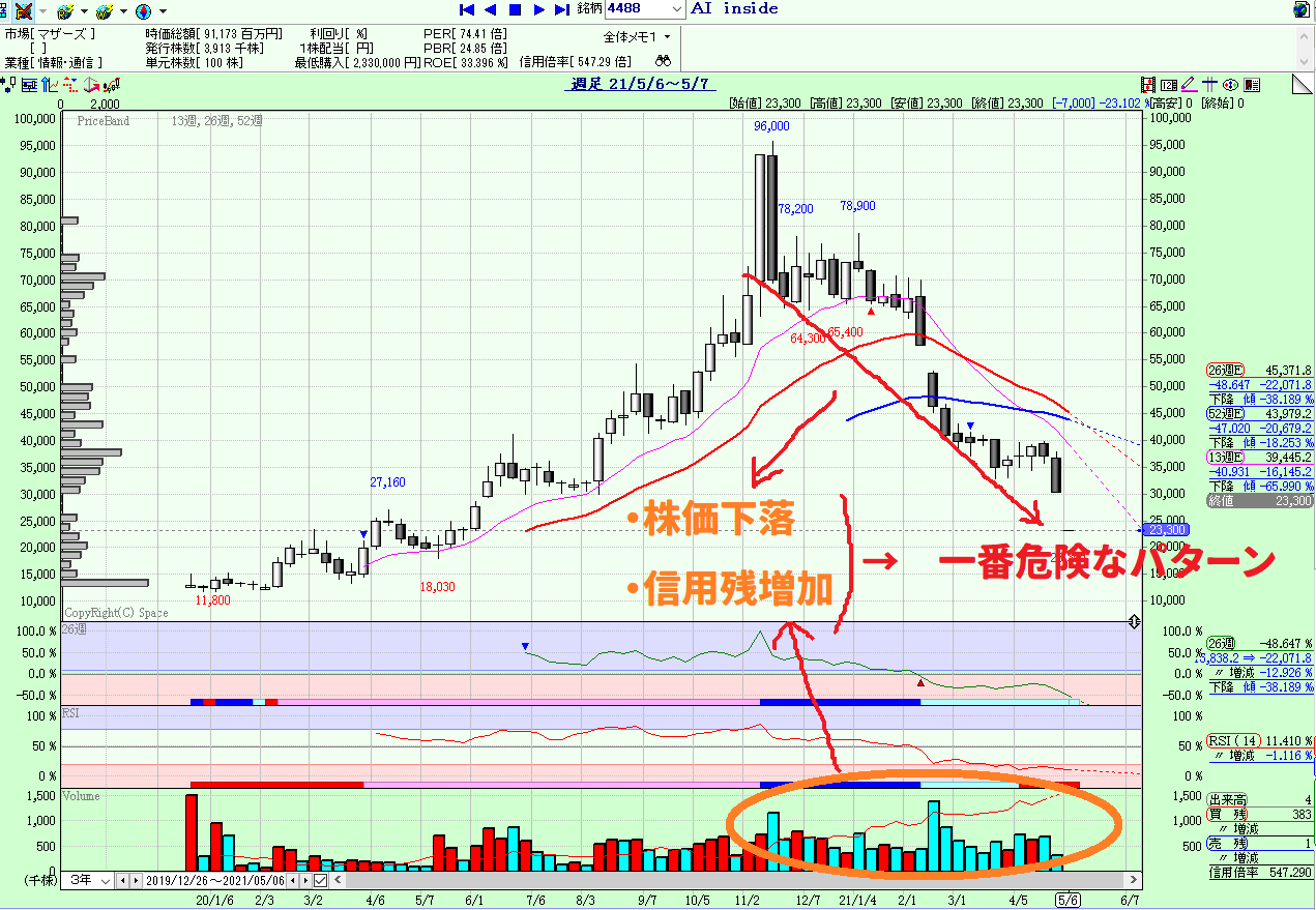 メリルリンチ、モルガン、クレディスイスと機関3社も入っていて、株価下落局面で信用買い残が膨らむという一番ダメなパターンになっています。機関は、この状態を好んで売り込んでくるので、当面、手出しは無用だと感じます・・・。