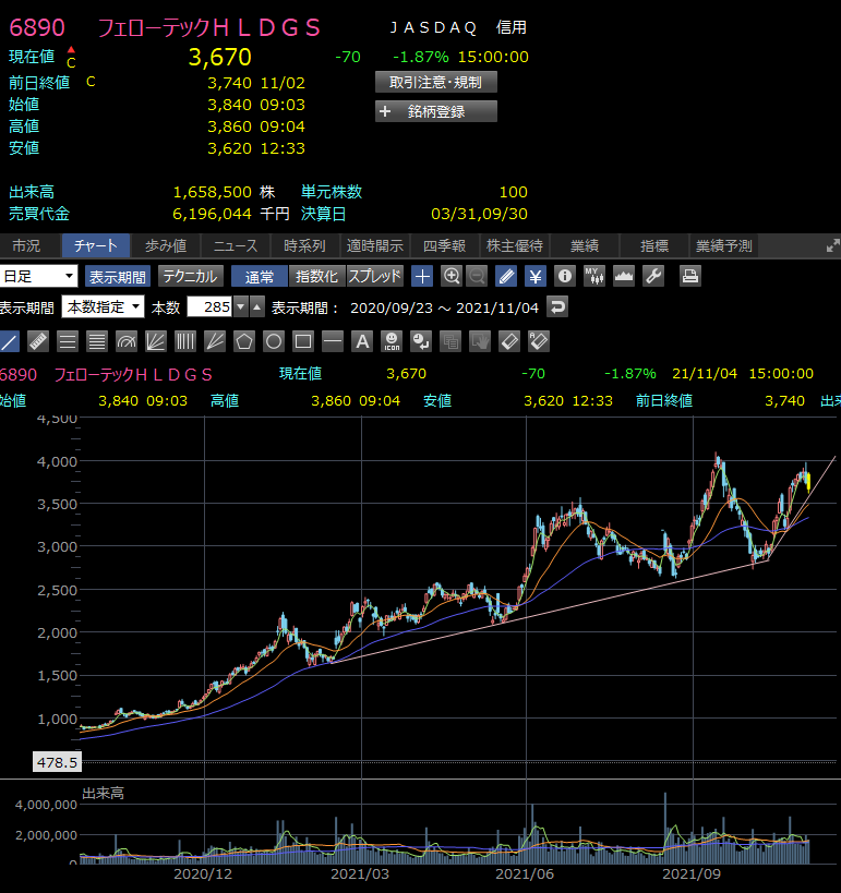まずは下値支持線上をキープできるかどうか。もし割ると調整目途としては、次は節目の3600円、3500円のラインです。50日移動平均線ですと3360円ですが、よっぽど地合いが悪く無いと、ここまで下がらないと考えます。
