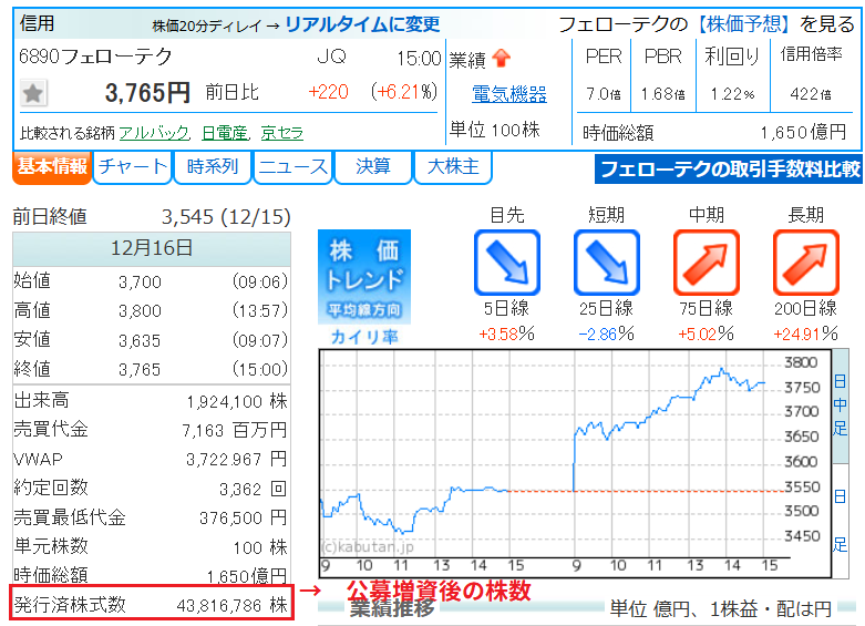 ちなみに、今、株探に載っているフェローテックの発行済み株式数43,816,786株は、直近の公募増資後の数量ですが、まだオーバーロットメント分である728,700株は反映されていません。