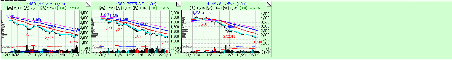 今日は、高PER株が売られる流れにある感じなので、予想PER100倍超の銘柄の中から空売りできる貸借銘柄(東証1部、2部、マザーズ、JASDAQ)をピックアップしてみました。