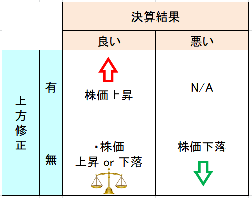 一般的な考えで「決算結果」と「上方修正」との関係をマトリックスにしたものが以下になります。