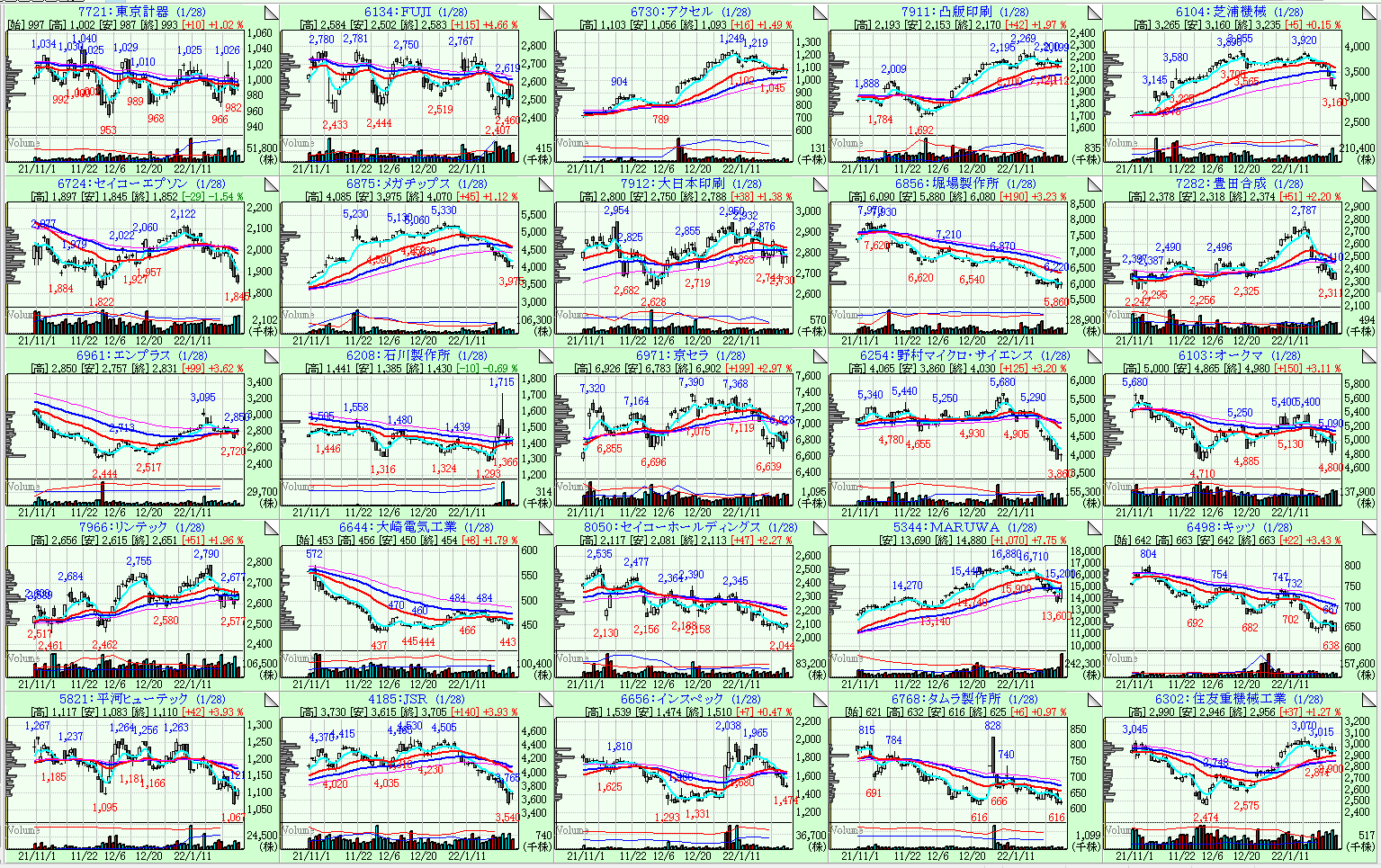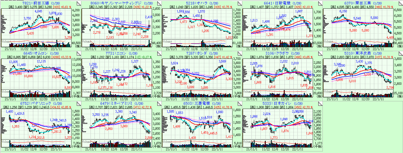 あと不幸中の幸いというか、直近では、アップルの決算がとても良かったので、もしかすると月曜以降、半導体関連に対する地合いが変わって、決算に対する反応が良くなる可能性も大いに考えられます。特に信用残が売り長の銘柄の方が上昇への感応度が高いと思いますので、今回は左上から売り長順にソートした半導体関連のチャート一覧を載せておきます。