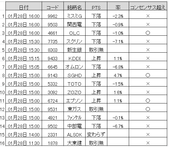 1月28日決算発表後の主要銘柄のPTSの動き等を調べてみましたが、まずコンセンサスを超えていたものは、16銘柄中4銘柄のみ・・・。