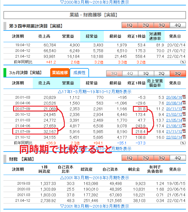 時系列に4ー6月、7-9月、10-12月と比較すると判断を見誤る可能性があるので、必ず前年同期比の同時期で比較しましょう。