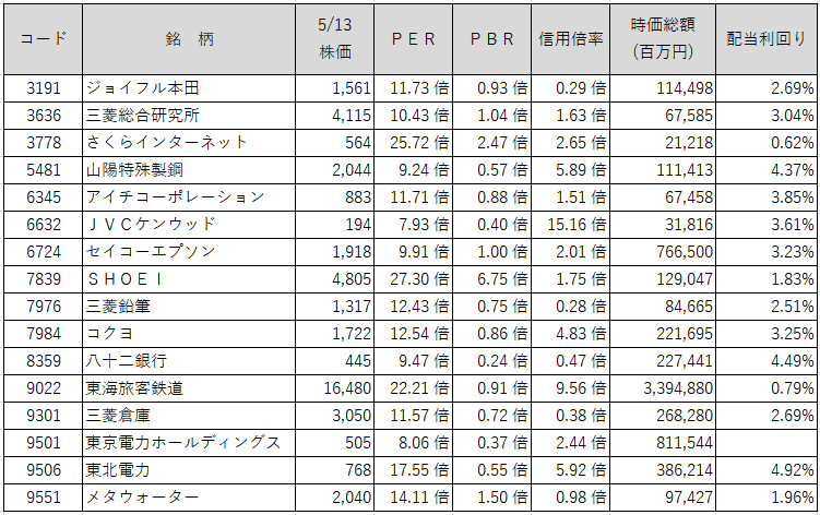 抽出した銘柄の概要データは以下の通りです(銘柄コード順のソートです)