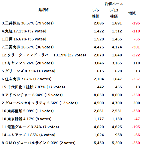投票後に結果を見ることができるので、他の方が注目している銘柄も分かりますので投資の参考になると思います(^_^)