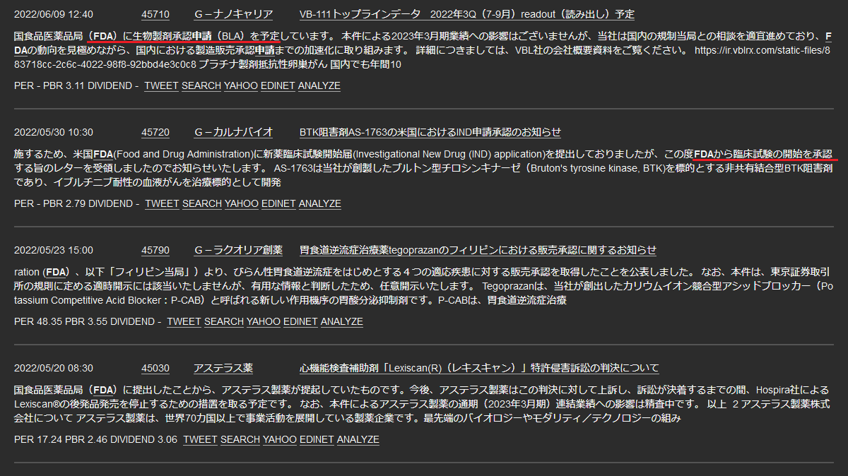 逆に言うと、FDA申請情報を先取りして掴めれば、事前に爆騰しそうな宝くじ銘柄を仕込むことができます。