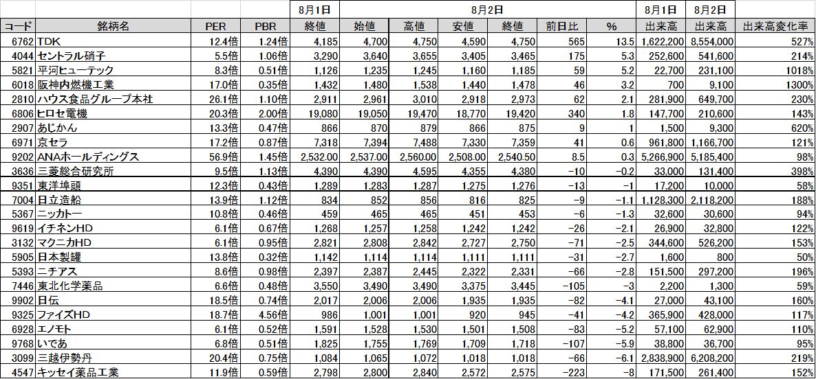 8/1決算発表 決算結果が好感されて上昇した銘柄、出尽くしで下がった銘柄