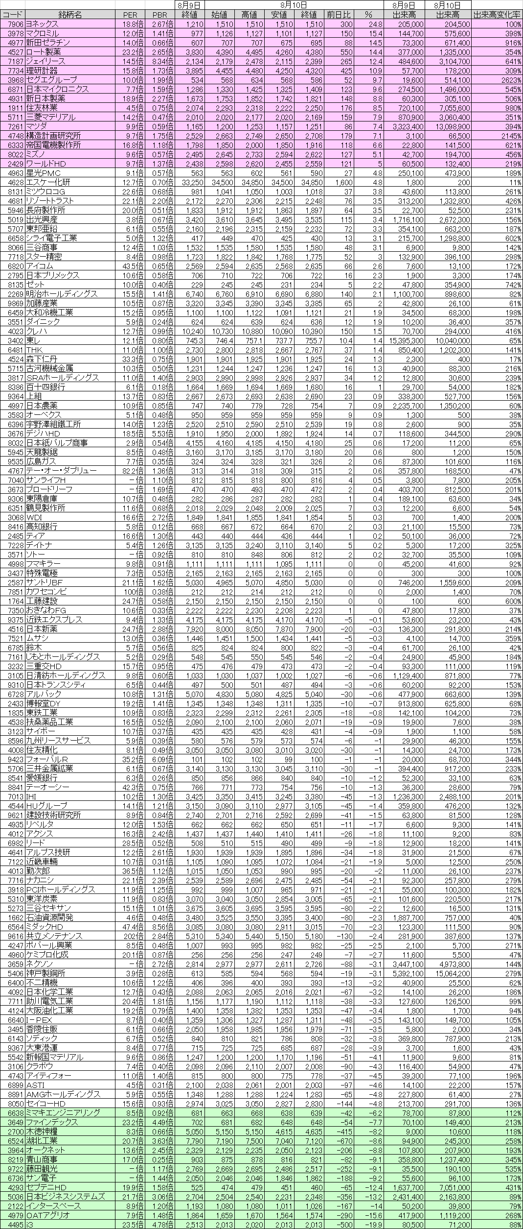 ※一覧表の方では、出来高ゼロだった銘柄を省きました。