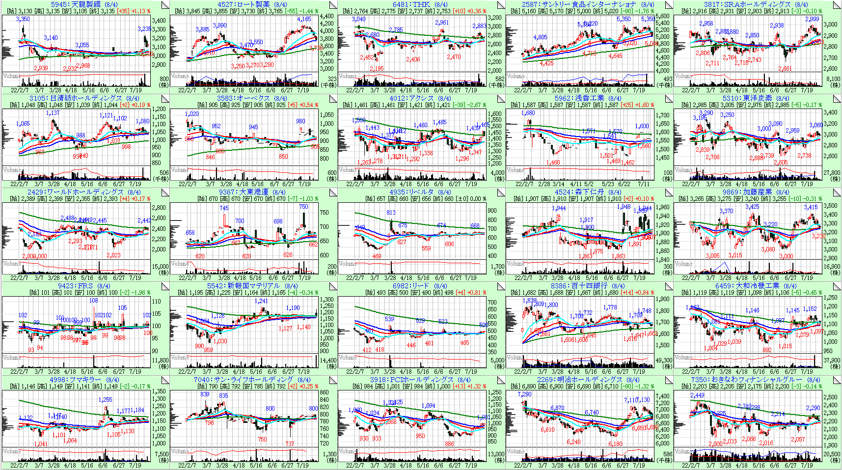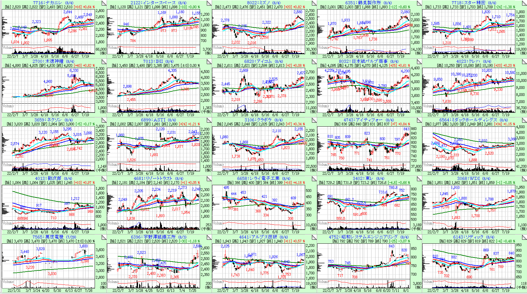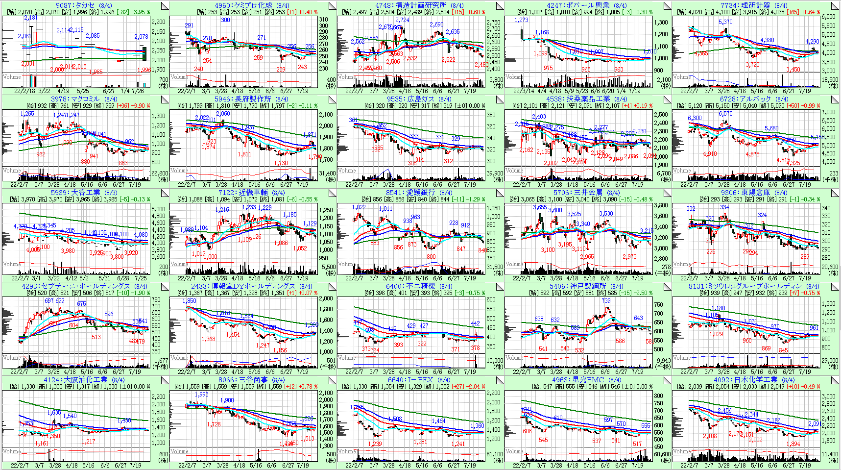 今回は26週線の傾きが大きい順に左上からソートしています。