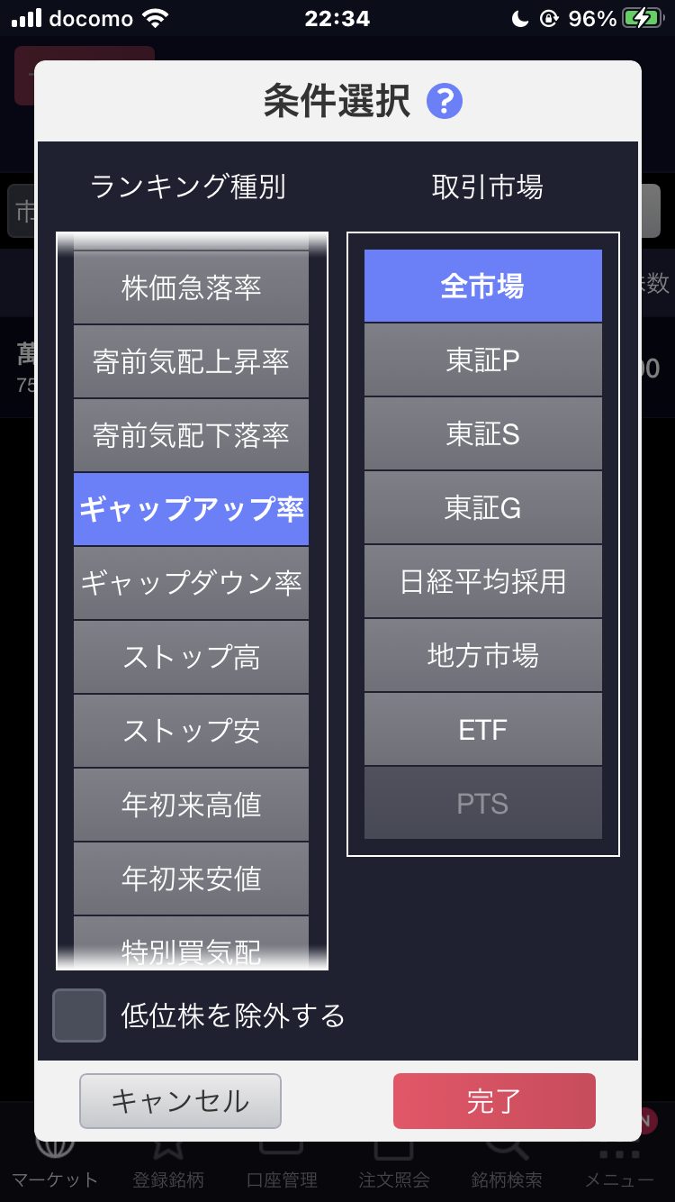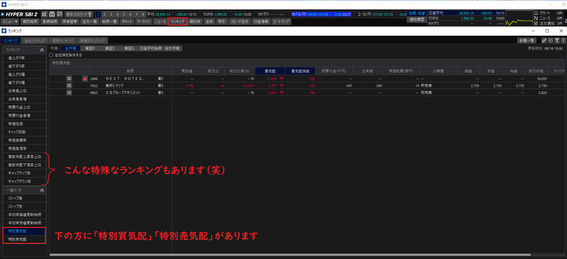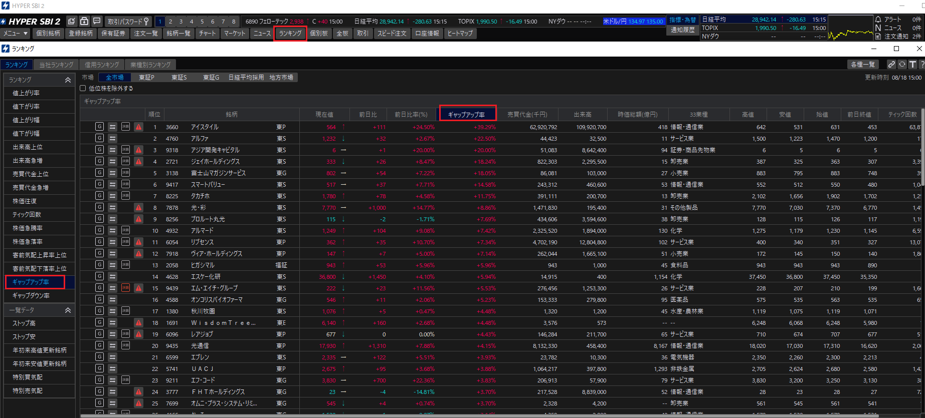 例えば、銘柄ランキングを見ても、「値上がり率」と「値下がり率」しかないし、どっちも寄り付かないとランキングに出てこないと思っている方、いませんか?今の時代、すごい便利なので、売り気配、買い気配銘柄を1発で表示するやり方があるんですよ。