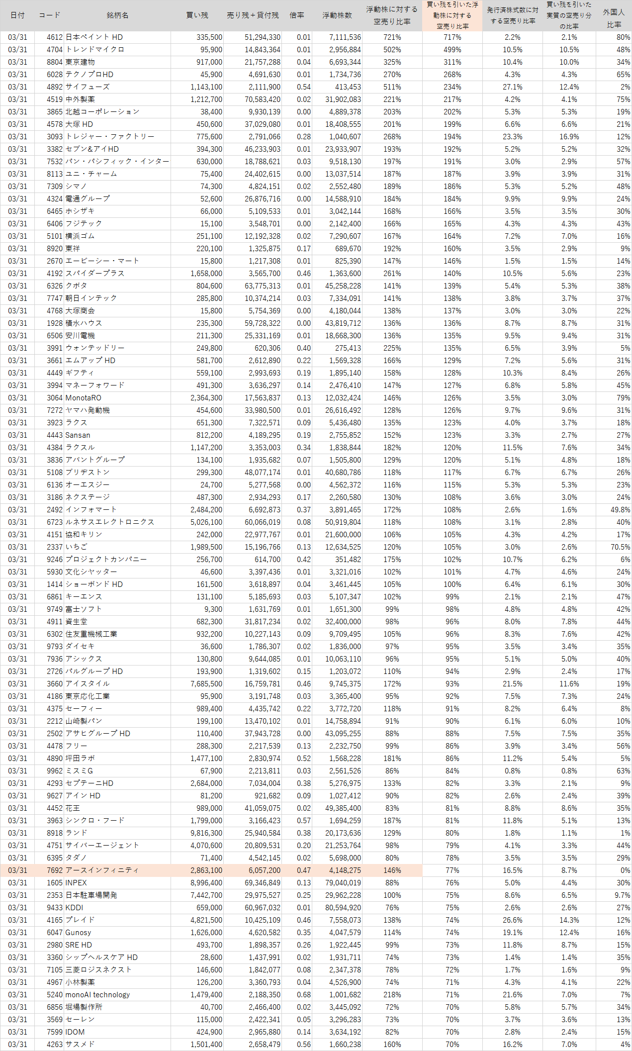 今回は、東証上場の全銘柄の中から、「浮動株に対する空売り比率の高い順」にソートしました。