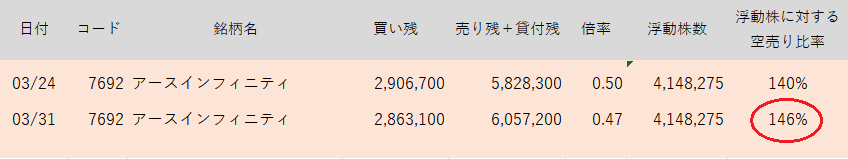 アースインフィニティの「浮動株数に対する売り残+貸付残」前回データとの比較