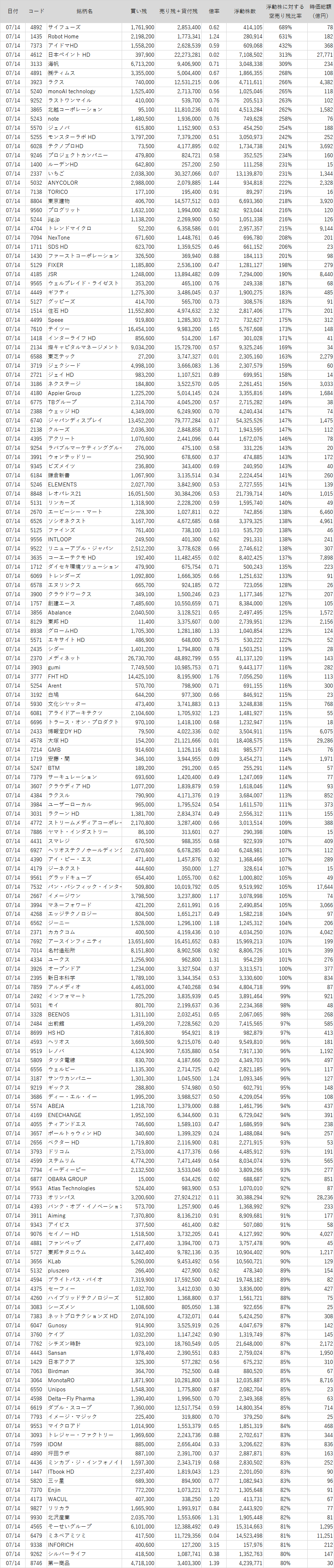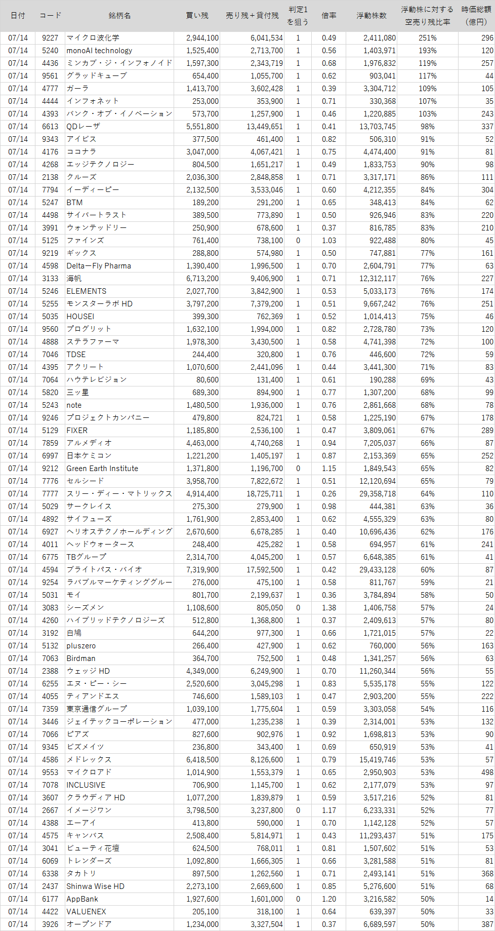 浮動株数よりも売り残+貸付残が多い銘柄ランキング【2023/7/14版】