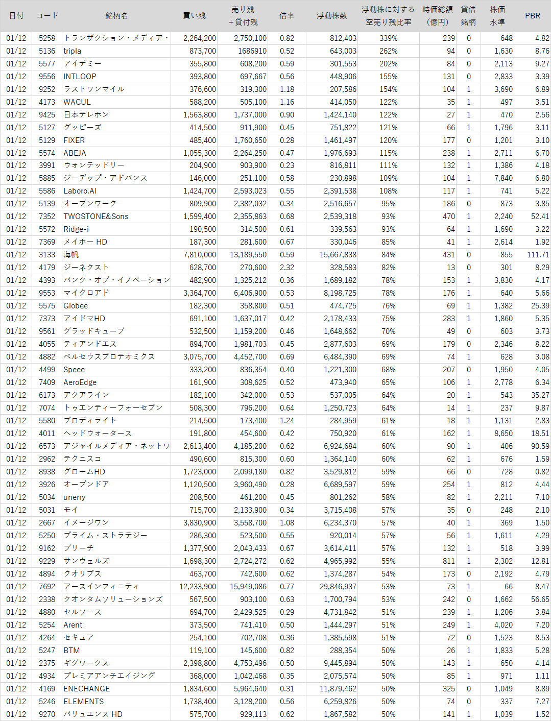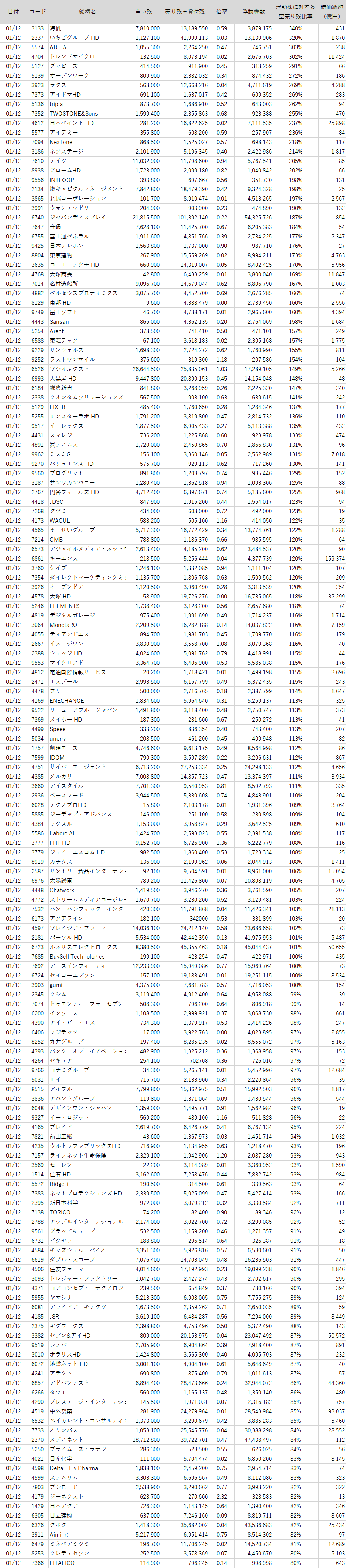 浮動株数よりも売り残+貸付残が多い銘柄ランキング【2024/1/12版】