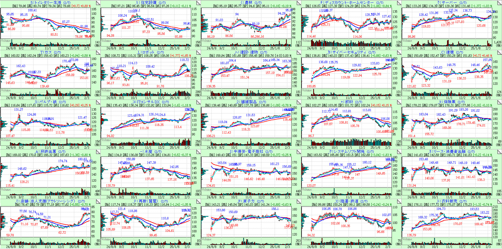 5日移動平均線の傾きが大きい順に左上から並べています。