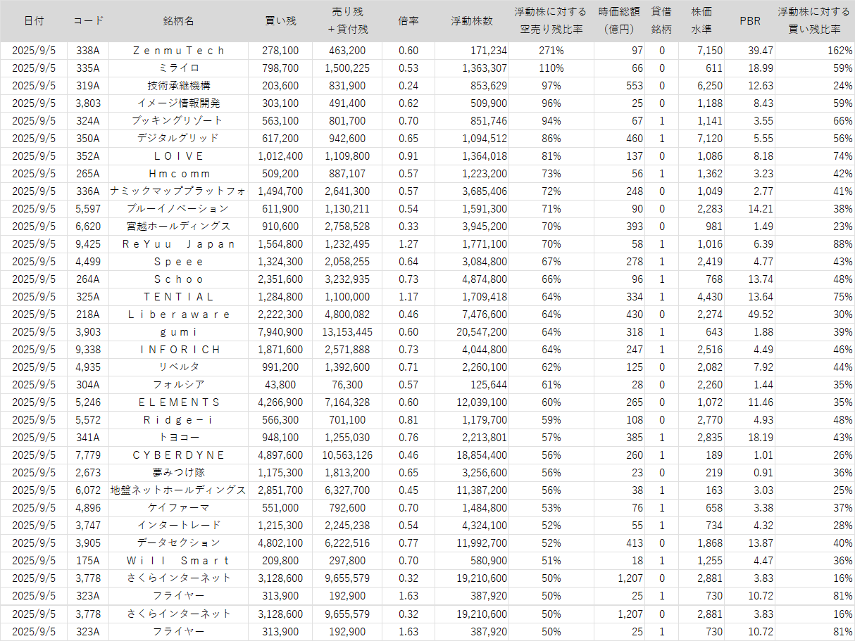 浮動株数よりも売り残+貸付残が多い銘柄ランキング【2025/9/5版】