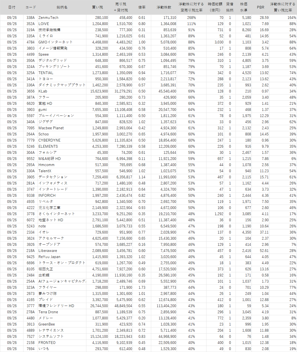 浮動株に対する空売り残比率が40%を超えている銘柄を掲載しています。