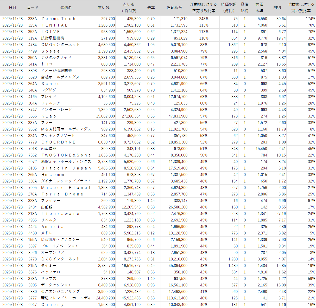 浮動株数よりも売り残+貸付残が多い銘柄ランキング【2025/11/28版】