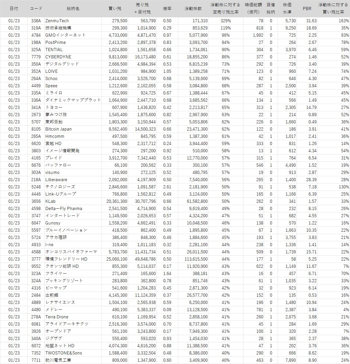 浮動株に対する空売り残比率が40%を超えている銘柄を掲載しています。