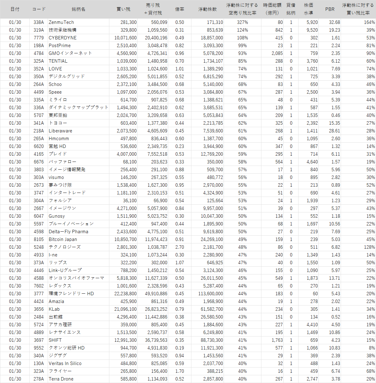 浮動株数よりも売り残+貸付残が多い銘柄ランキング【2026/1/30版】